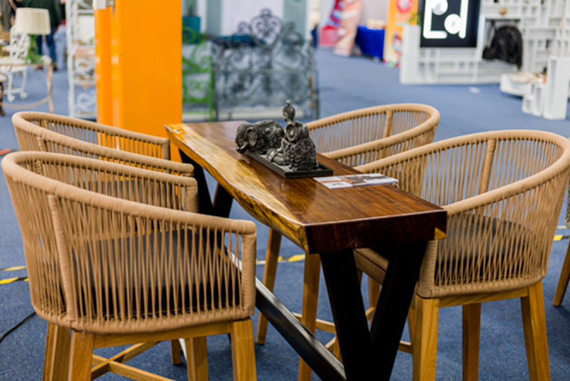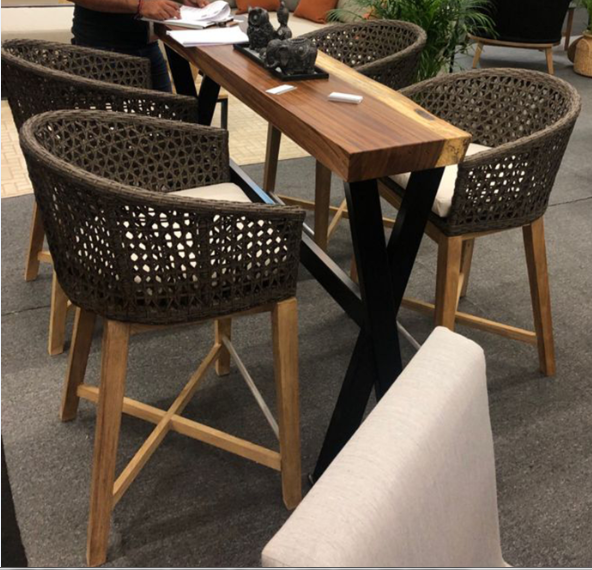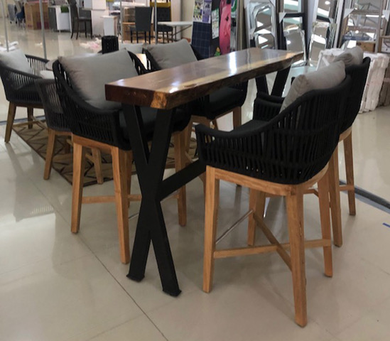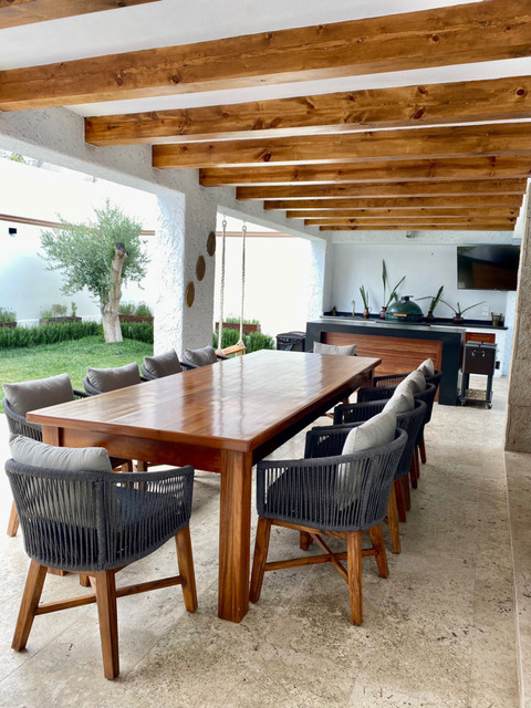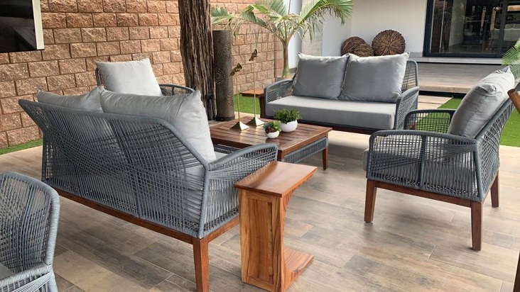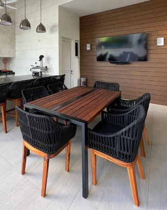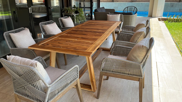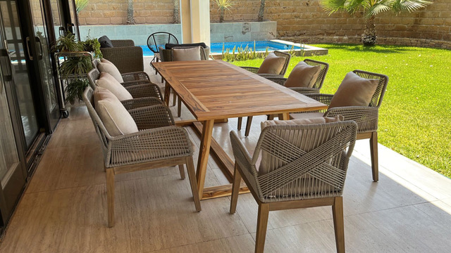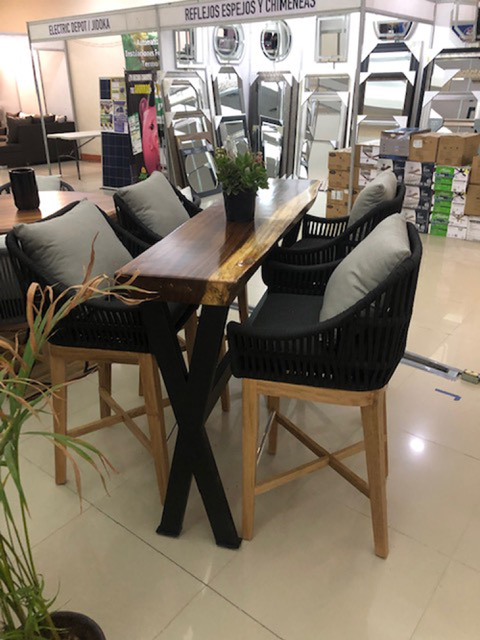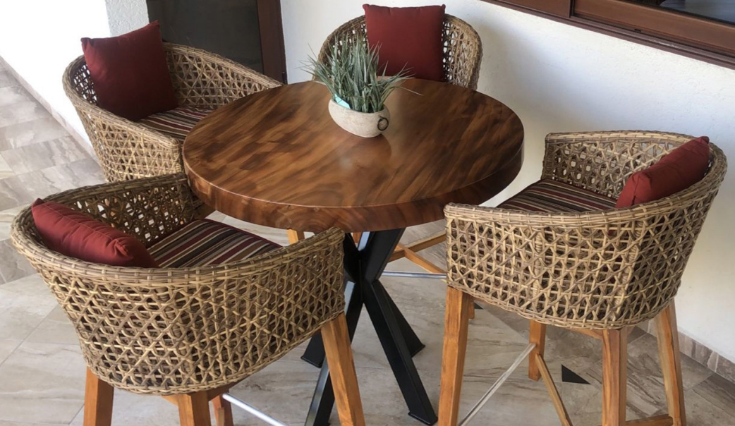 Mesa: Madera de PAROTA. Sillas: Modelo LETY con forro tela sunbrella.