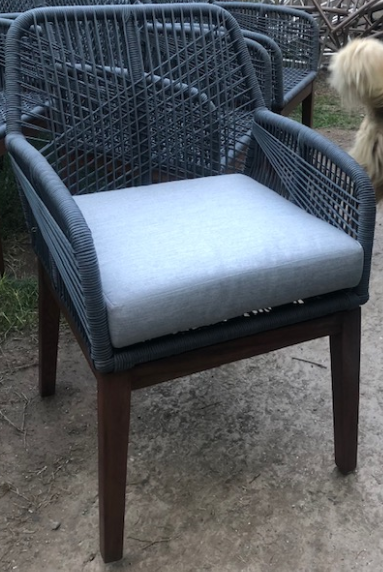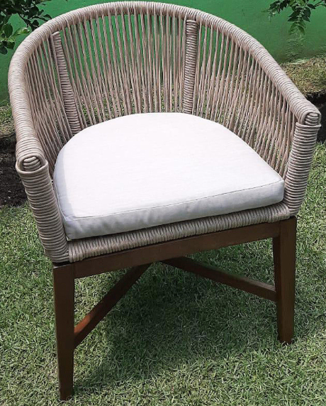 Mesa: PAROTA. Sillas: Resistente estructura de aluminio tejida en Nylon redondo y cojines en tela sunbrella.