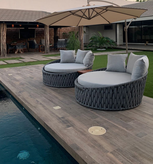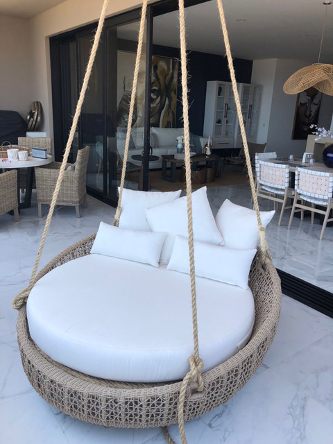 Resistente estructura de aluminio tejida con Nylon redondo. Cojines forro tela SUNBRELLA.