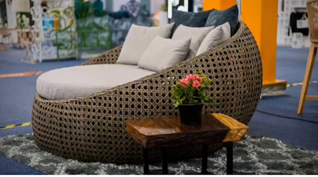 Resistente estructura de aluminio tejida con rattan sintético y cojines en tela sunbrella