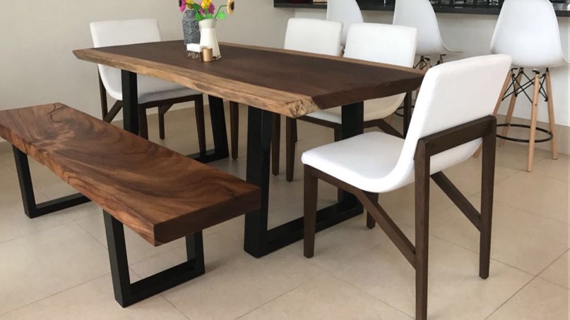 Moderno y elegante comedor que combina sillas Ana María con una banca, para los que llevan más prisa